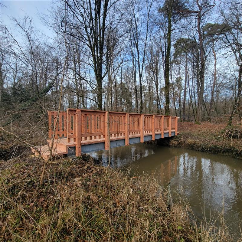 Le choix s’est porté sur une passerelle durable avec un socle métallique et un platelage en douglas. Longue de 10 mètres, elle a été installée le mardi 13 janvier 2026 et co-financée par la Ville de Haguenau, l’Office National des Forêts et la Collectivité européenne d’Alsace.